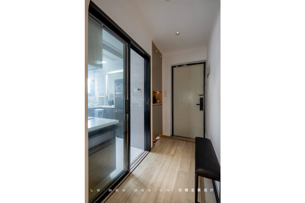 玄關區域通過廚房大面積的玻璃來增強自然采光,鞋柜用來收納夫妻倆的鞋帽已經足夠,過道區域再放一張用來換鞋的長凳,換鞋更加方便