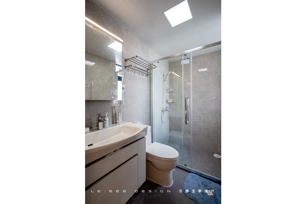衛生間由于居住人數不多,所以就不把浴室柜單獨分離出來,而是在洗手間里面做了干濕分區,功能區做的布置也比較合理。