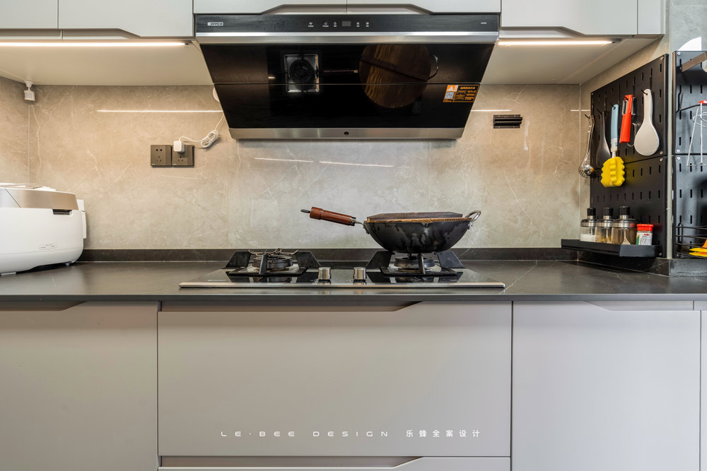 不管是烹飪區(qū)還是臺盆區(qū)在吊柜下方都有燈帶來輔助照明,畢竟單純以來頂面的采光還是會有被遮擋的陰影區(qū),吊柜上的燈帶能有效補充光源,防止摸黑;灶臺旁邊的收納架顏值很高也很實用。
