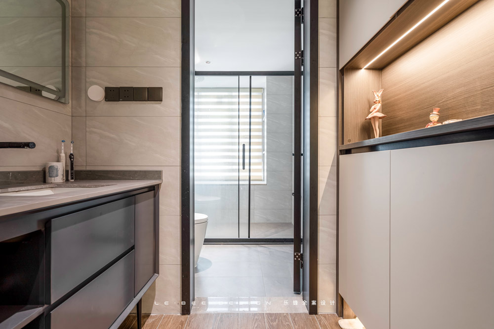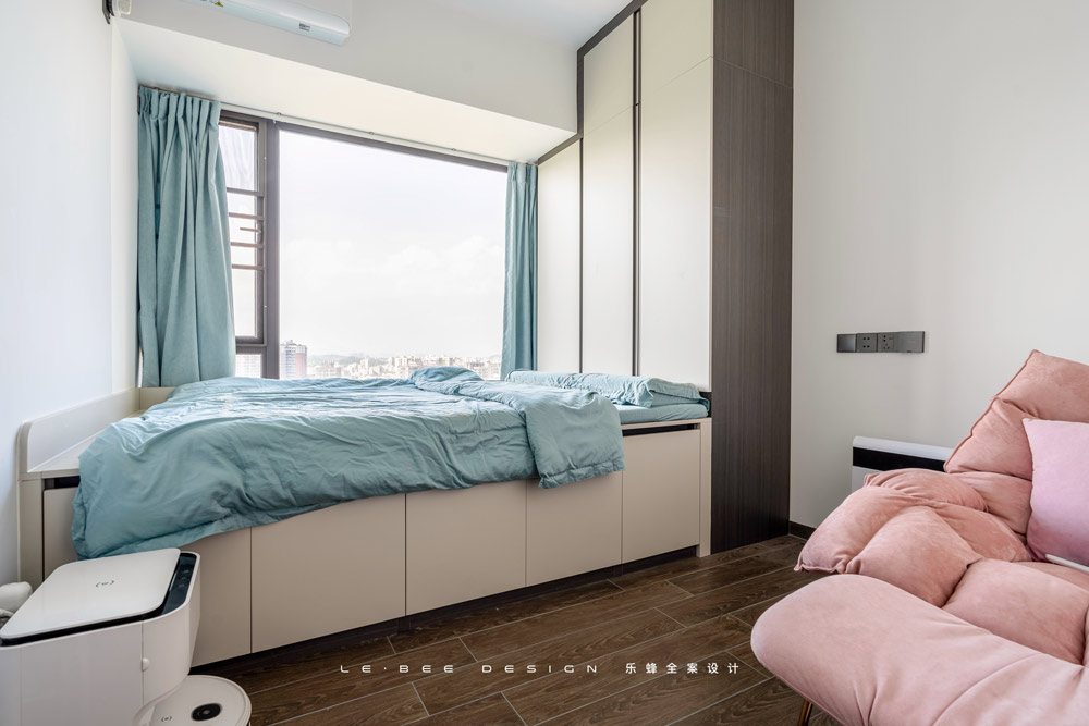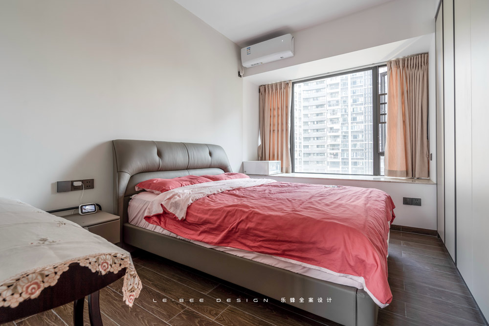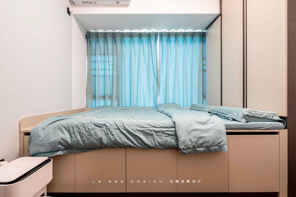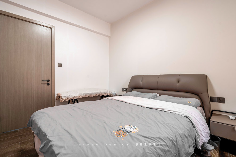 因為主臥衛(wèi)生間空間的合理分配,從而時旁邊次臥的空間得到有效補充,在床尾的整排衣柜是繼衣帽間之后的第二大衣物收納空間,有效承擔了換季衣物、被褥的收納任務。
