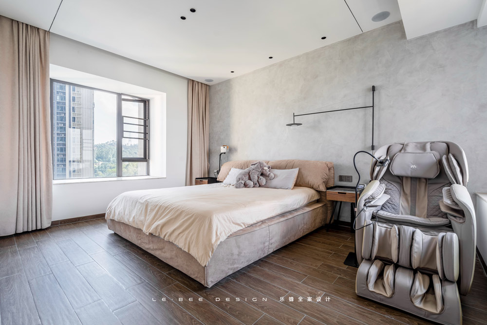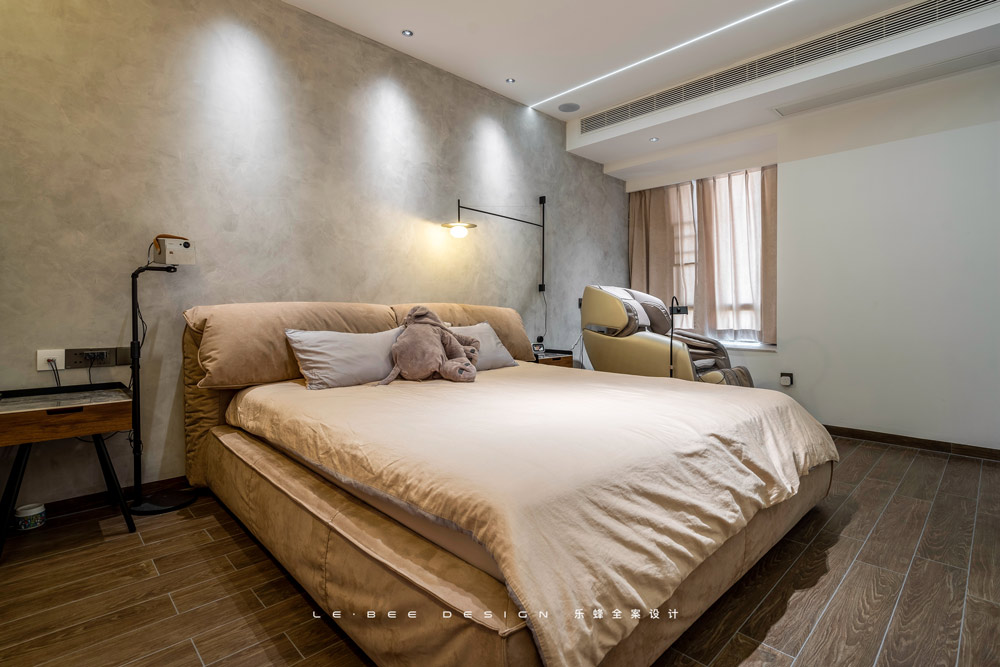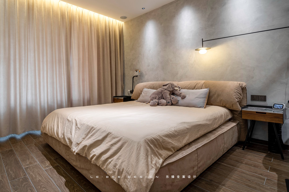 主臥溫馨的氛圍在軟裝、燈光、硬裝材質上體現(xiàn)得淋漓盡致,窗簾盒里內嵌的暖光燈帶打到窗簾上增強窗簾質感,床邊的長臂床頭燈能方便屋主在床上夜讀和刷手機的時候保護視力。