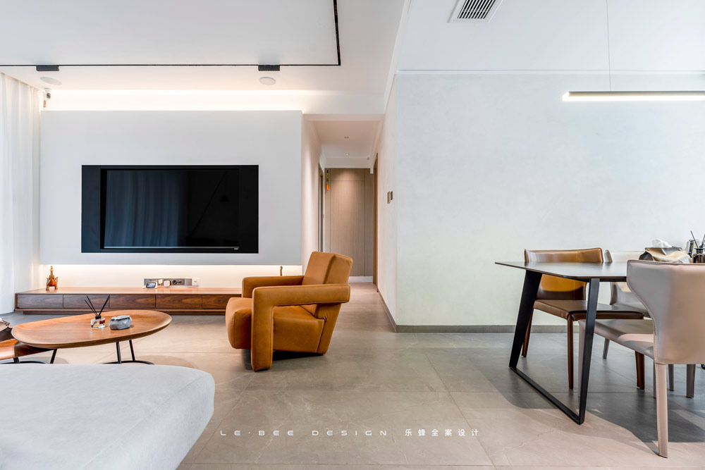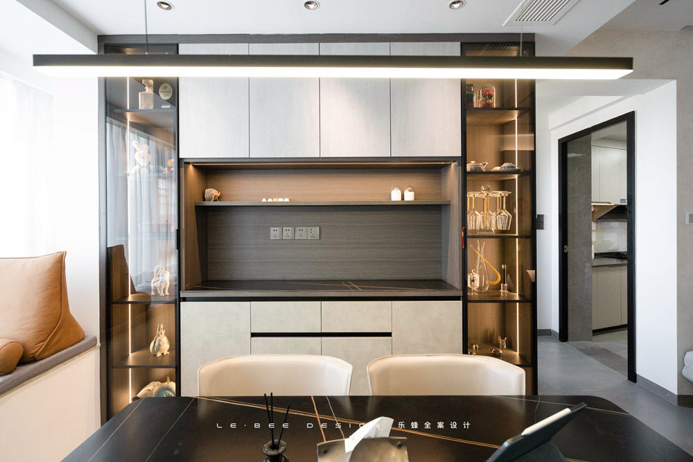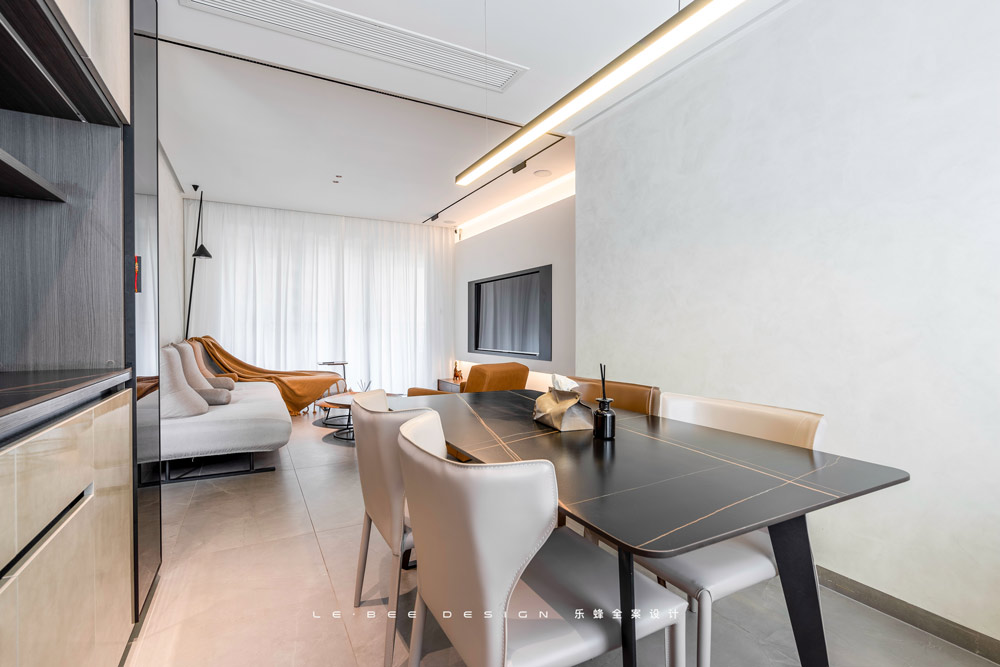 我們將客餐廳聯(lián)系起來看,地面通鋪的柔光磚相比于亮光地磚更加具有質感,十字動線串聯(lián)起客餐廳、玄關和各個房間聯(lián)系,燈光又以不同的照明形式來增加空間的層次感。