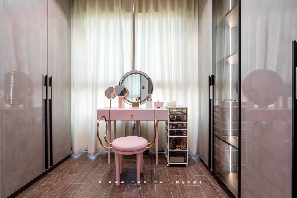衣帽間大概是每一個女生的夢吧,柜體燈光的加持下,柜子里能夠存放展示的物品來愉悅自己的內心,粉色的梳妝臺喚起滿滿的少女心,和梳妝臺抽屜相配合的儲物空間是旁邊用來存放化妝品的收納小推車,化妝時取用任何物品都很方便。
