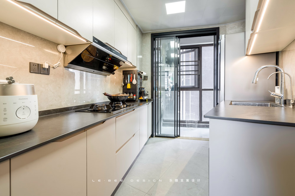 廚房布局呈左右雙一字型的形狀,冰箱和臺盆在一側,從冰箱里拿出來的食材可以加工后進行清洗,再轉身進行烹飪,動線清晰明了,中間留出通往生活陽臺的過道,生活陽臺這邊用雙扇加高的推拉門來增加空間的采光。