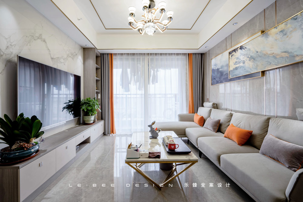 整體的灰色家具里點綴橙色小品,讓整個空間跳躍起來,使房間變得有溫度顯得更溫馨,電視柜上擺放著的綠植給整個空間增添一絲活力。
