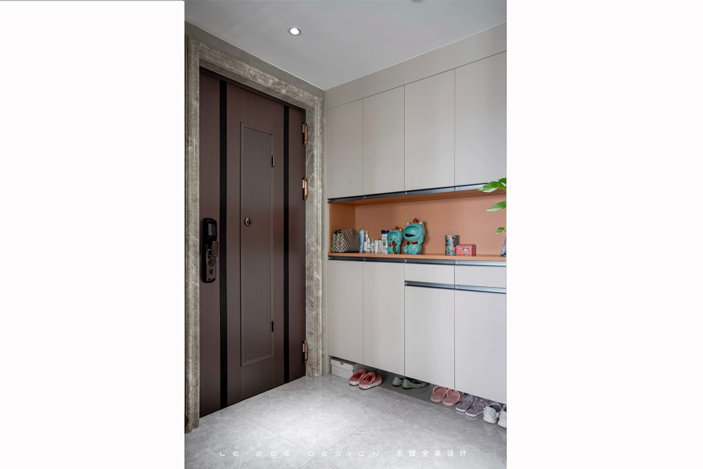 本戶走廊型玄關(guān),在進門處預(yù)留一段類似走廊的過渡區(qū),避免了進門一覽無余的尷尬,利用了過道空間將鞋柜嵌入墻內(nèi)打造I型玄關(guān)柜,儲物力滿滿,設(shè)計底部留空區(qū),可以放一家每日進出門的鞋,規(guī)整又好打理。
