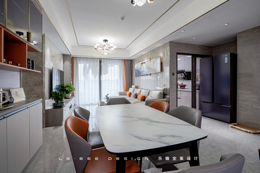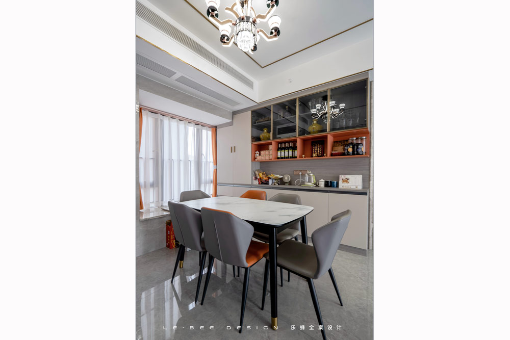 餐廳的墻面做了一整面餐邊柜,增加了收納空間。大理石的餐桌方便打理,灰色、橙色的餐椅與整個空間相呼應(yīng),使整個空間顯得不沉悶而又高級。