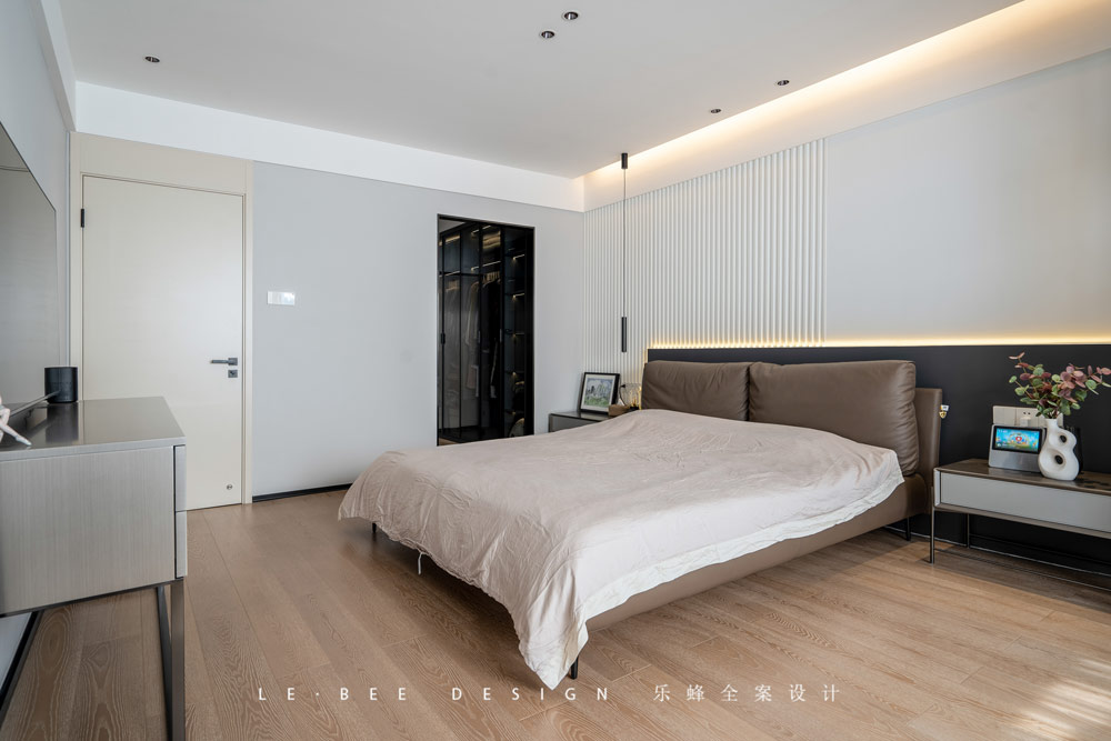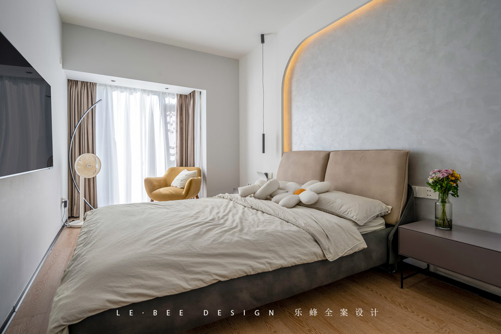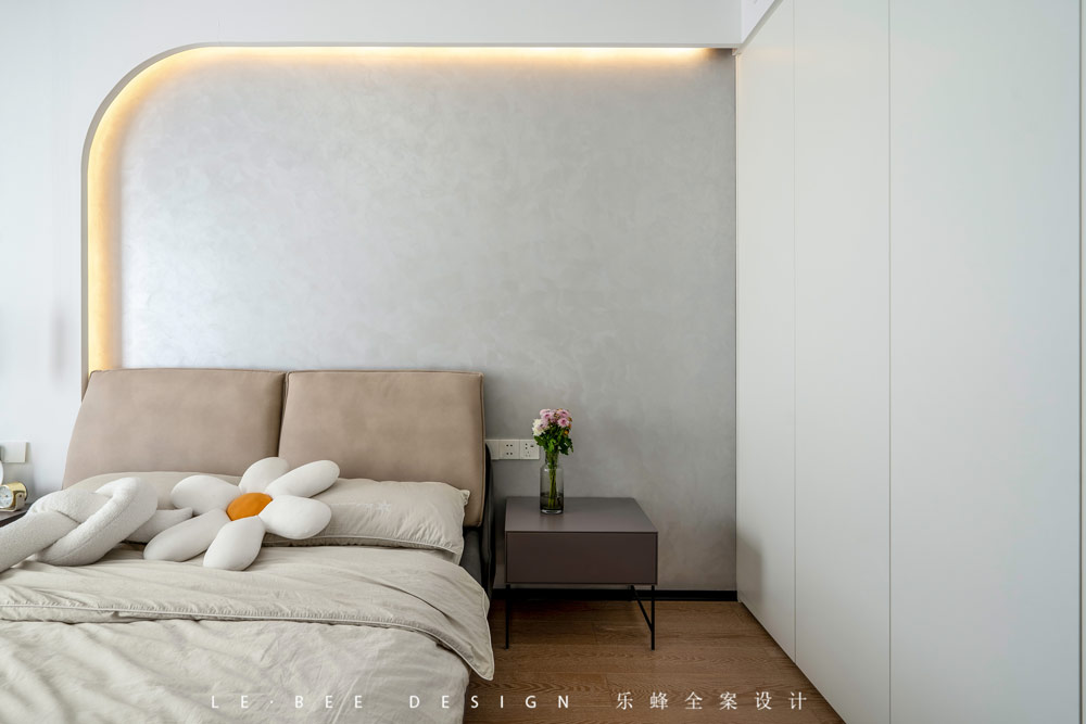 次臥室在設計上也做出了獨特的創新,墻面運用石膏板定制了暗藏燈帶的造型,通過前后的突出營造層次感,燈帶的光也讓空間更加有氛圍感。
