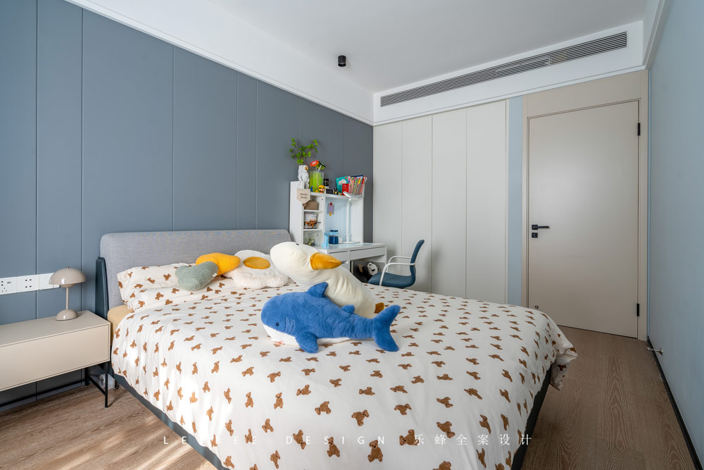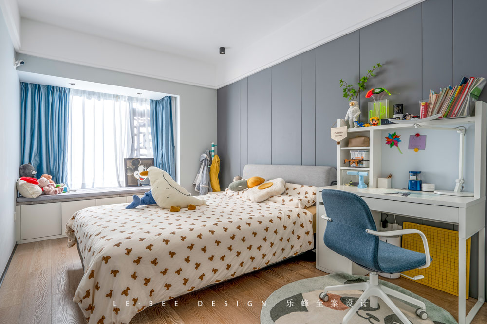 在兒童房的設計中,我們充分考慮了孩子愛玩的天性,運用的色彩也是傾向于童稚化的,整體以沉穩的藍色為主調,小面積的黃色點綴其間,軟裝配飾上也充分營造出童趣,符合小男孩7歲的年齡段應該有的童年布置。