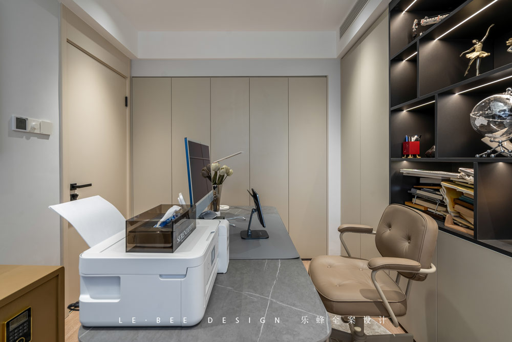 我們在二層還布置了一間書房,門后的一組柜體能夠作為二層換季收納的組合柜,書桌背后的柜子主要收納一些資料和書籍,同樣隔層的收納也能作為展示物品的光源。