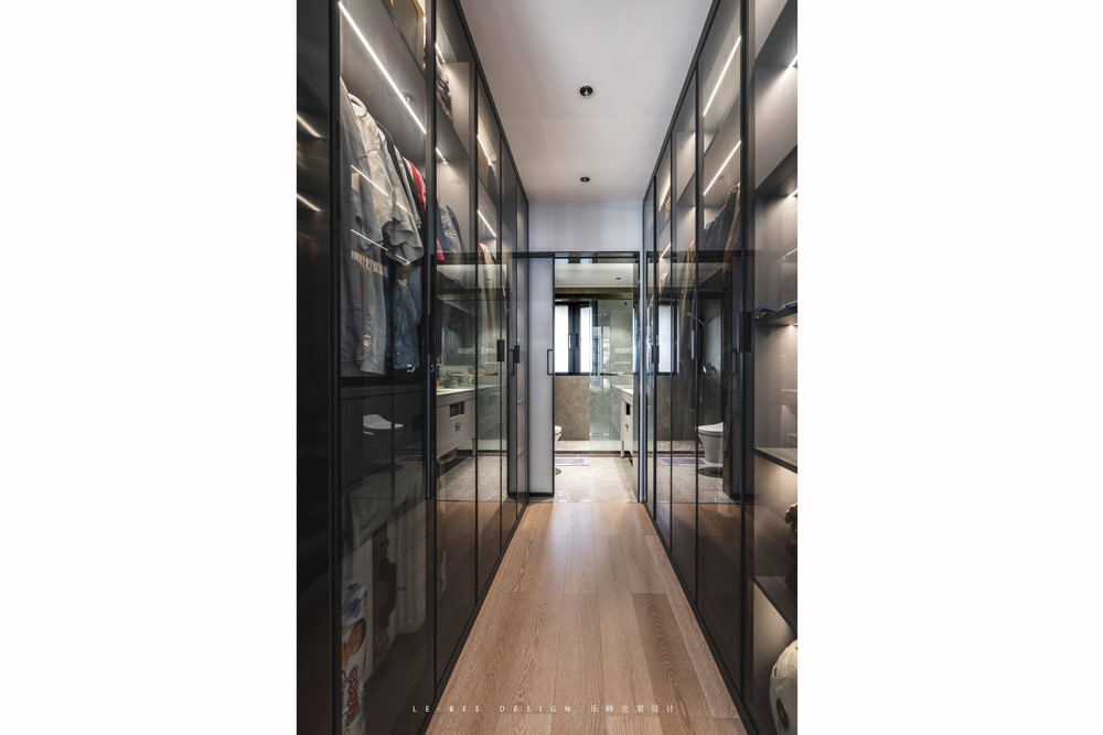 主臥的衣帽間通過黑色玻璃柜門和燈光布局,掩映出更加高級的氣場,每一排的柜子都搭配有燈光的設計,不會有內部的燈光暗區,雙一字型的柜子在收納的量也是很大的,為主臥的收納分擔了更大的壓力。