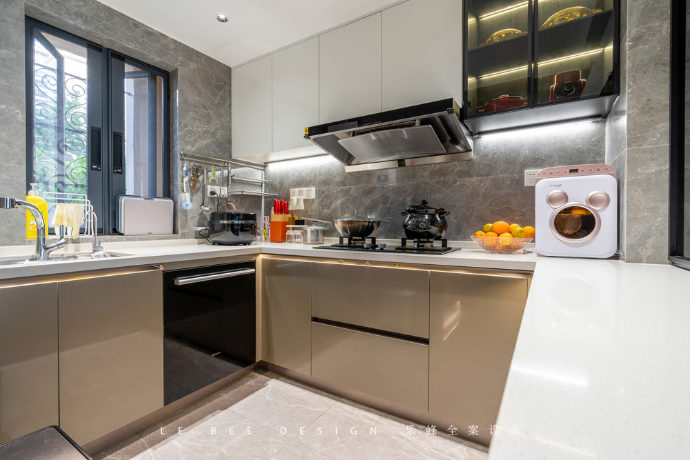U型的臺面設計讓整體的空間更加充沛,各種電器都能有專門的位置擺放,能夠操作的臺面長度也大大增加。