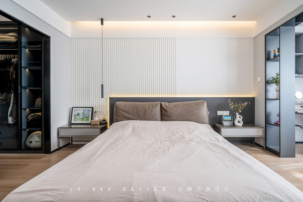 主臥在空間布置上屬于空間利用比較極致的處理,床頭背景利用純色的格柵和飾面來處理,相比于其他色彩來說,近似于純白色的搭配更加符合整個空間的調性。
