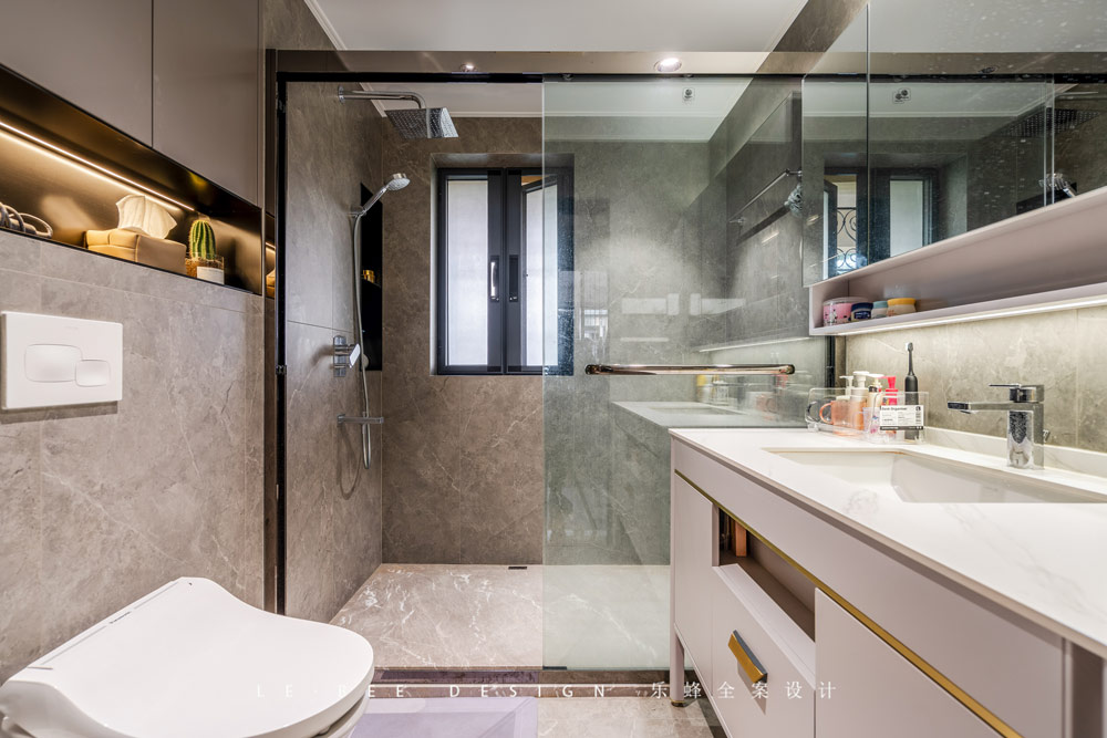 在整個家中為了使用的便利性,我設計了三個衛生間,其中最具代表性的是二層的公區衛生間和主臥衛生間,在公區衛生間上我們將浴室柜獨立出來做了二分離的設計。