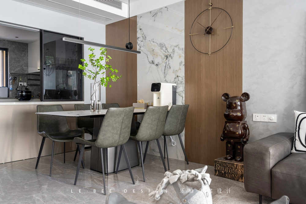 餐廳的背景墻融合了木飾面和護墻板的元素,三分法的形式將兩種材質進行無縫拼接,簡約的線條時鐘位于一側,打破了原有對稱的布置規律,給人以不一樣的感覺