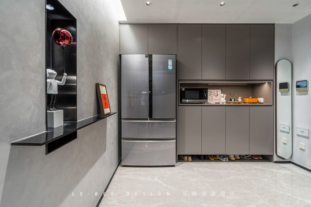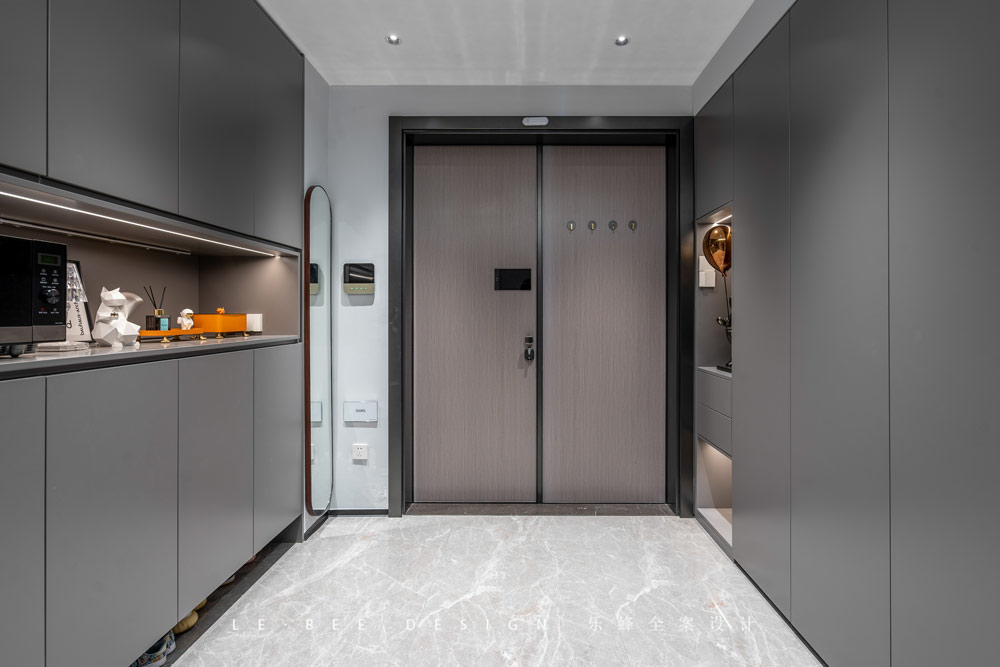 從大門進入家中寬敞舒適的玄關讓人感到放松,左右兩側厚度不同的收納柜能收納不同尺寸的物品,邊上的全身鏡能讓屋主在出門前檢視好自己的衣著,這對注重細節的屋主來說是非常不錯的設計。