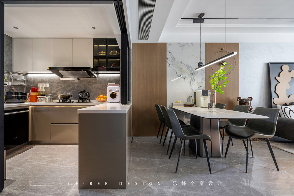 在餐廚的關系上我們采用了半開放式的格局,推拉門和櫥柜上方的窗能夠增強客餐廚的溝通感,讓整個公共區域空間感更加好,在做飯的時候拉上推拉門窗能夠有效隔絕油煙,保持客餐廳整潔。