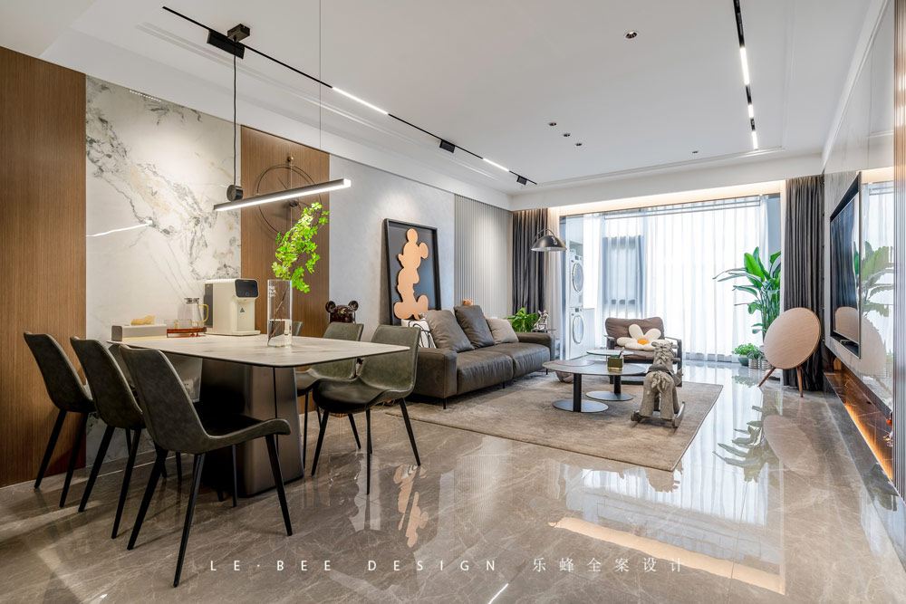 方正的客餐廳給人以寬敞的視覺感受,無主燈吊頂的燈光也因此變得更加具有延伸感,磁吸軌道燈負責整體照明的點亮,筒燈則能夠照射重點區域給燈光以層次感。