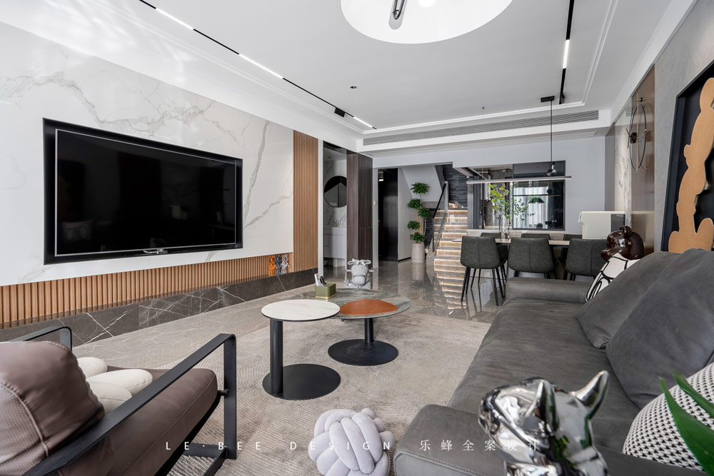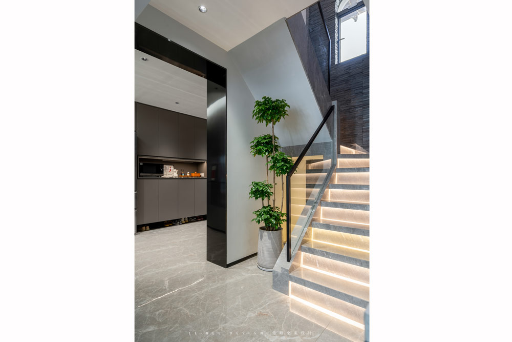 新澆筑的樓梯在造型上能夠重新設計,樓梯采用石材+反光燈帶的設計,氛圍感滿滿,樓梯扶手的黑色不銹鋼+玻璃的材質讓空間更顯高級