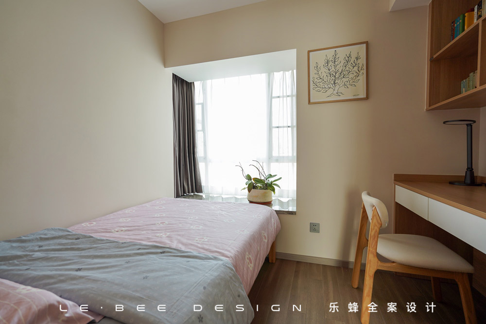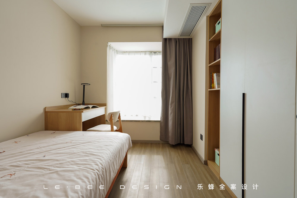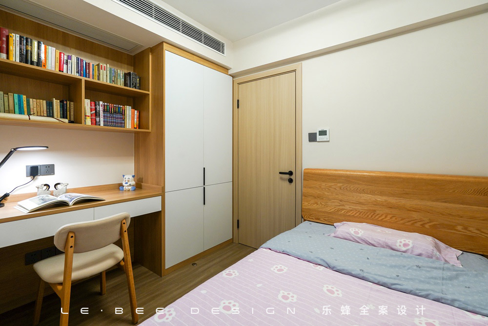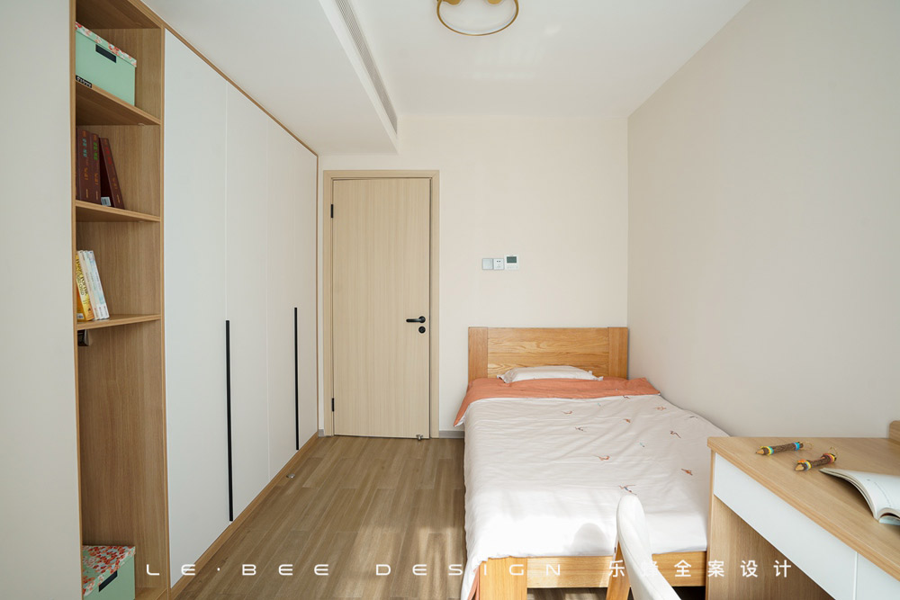 次臥的功能區在兩側,中間留下較為寬闊的過道,空間更顯寬闊,學習、取物、更衣和入睡的動線也更加便捷。