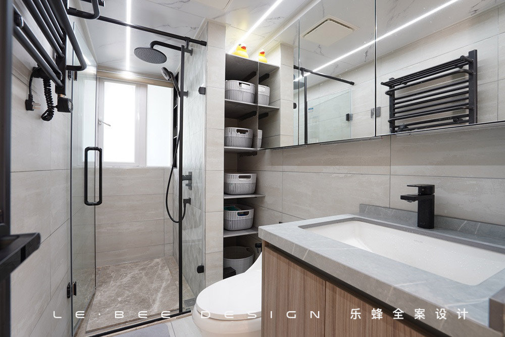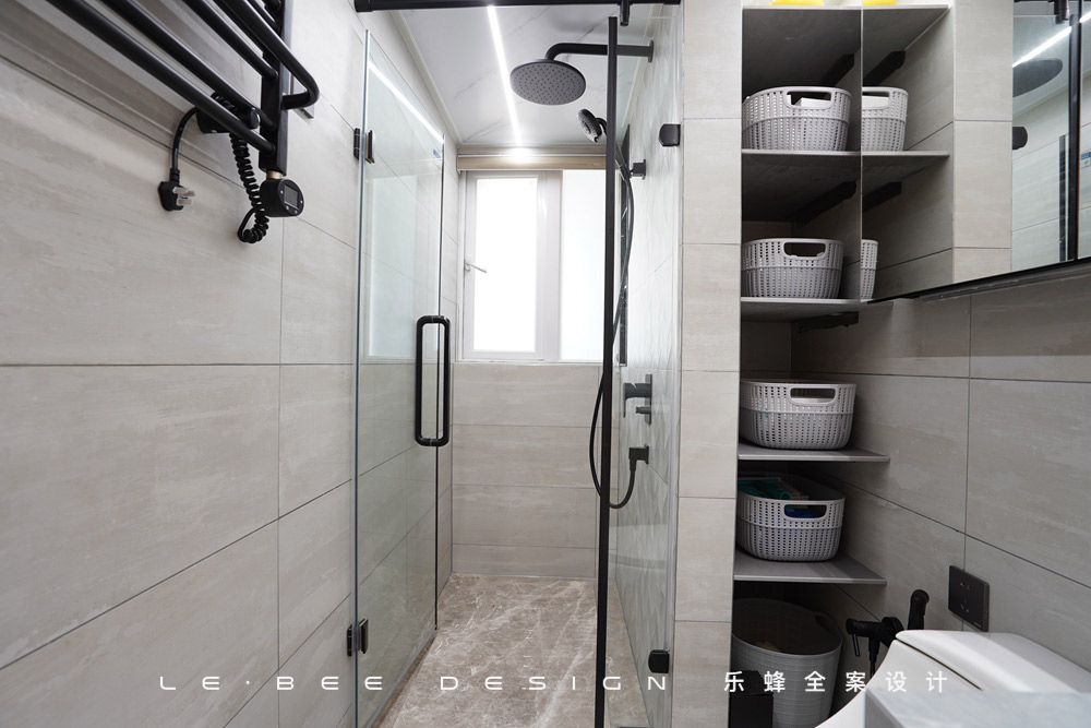馬桶一側墻面挖空做壁龕,提高了整個空間利用率,方便放置雜物和換下的衣物。