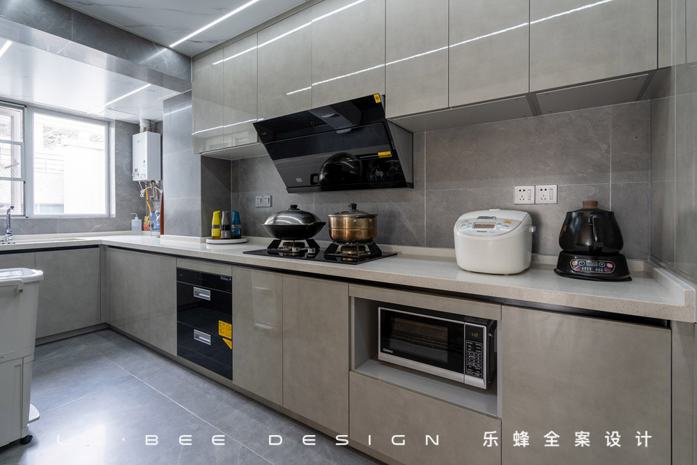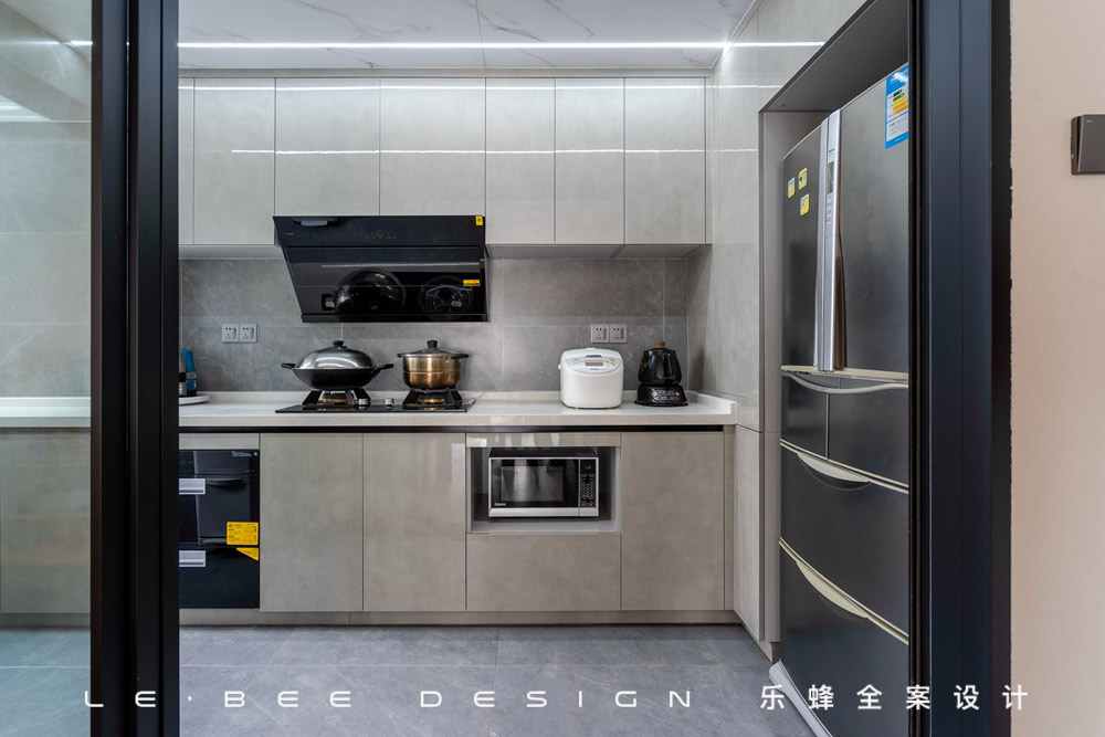 廚房的燈光選用的是燈帶的設計,光線照射均勻并且十分前沿和個性。