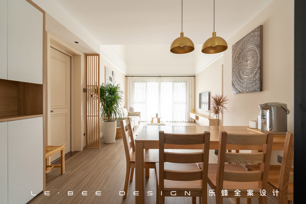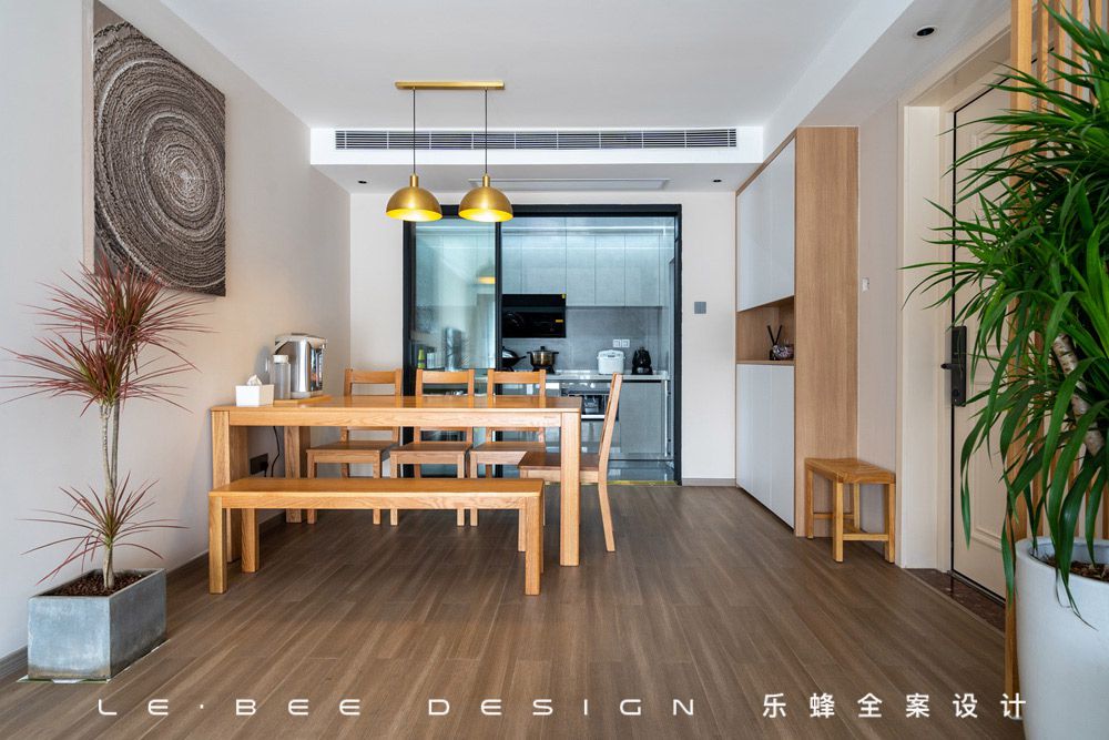 從客廳到餐廳視線無障礙,規整的空間結構一覽無余。餐桌采用原木餐桌,田園氣息濃厚。金屬元素的吊燈跳躍的同時并不突兀,加強了空間裝飾的可玩性。