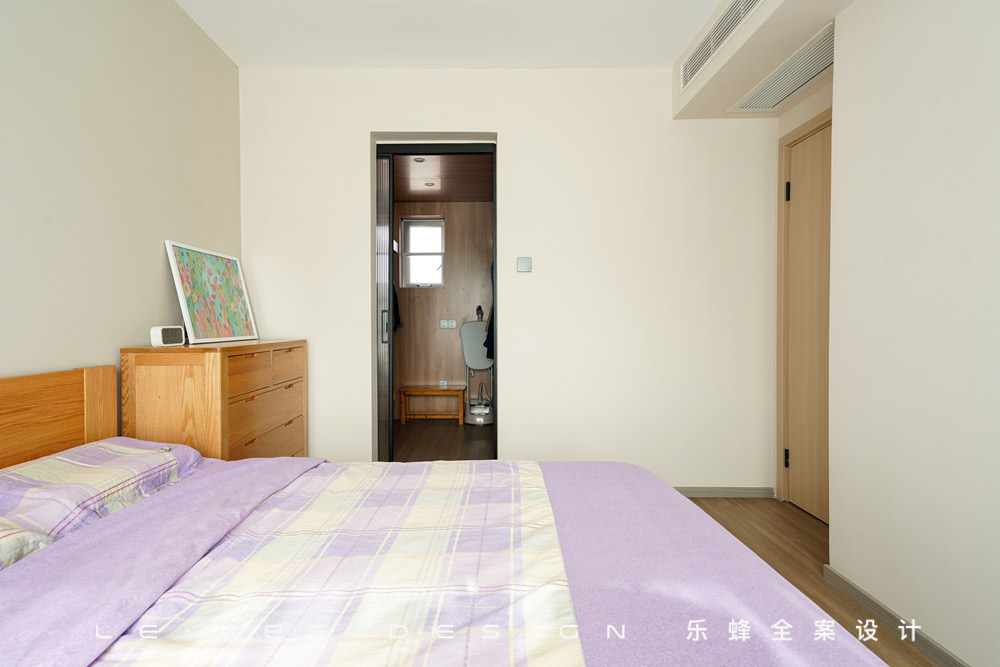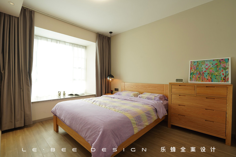 主臥的主色調采用的是原木色調,床品選用淡紫色來增加活潑和明亮的氣氛。房內省去了繁瑣的裝飾,選擇了實用性和裝飾性兼具的床頭吊燈和收納性能很強的床頭柜,裝飾畫點亮主題——田園、清新。