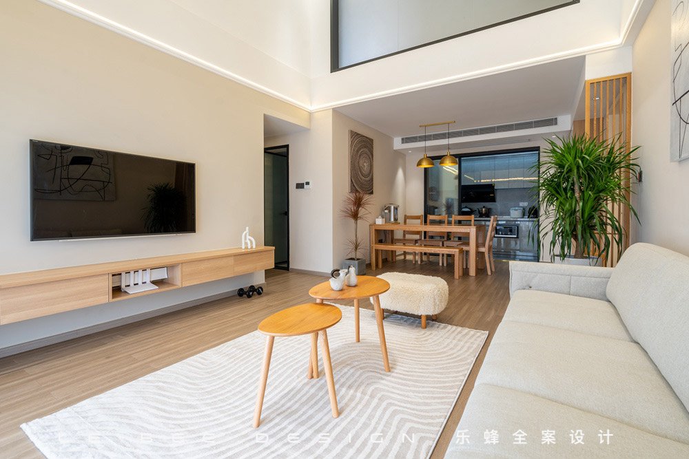客餐廳為視覺中心區,原木地板搭配無暇的墻面,搭配基礎功能的布藝沙發、電視柜,給予了空間最大可能的留白,空間的開闊延伸發揮到了極致。立足于此,巨大的包容感和滿足感侵上心頭。