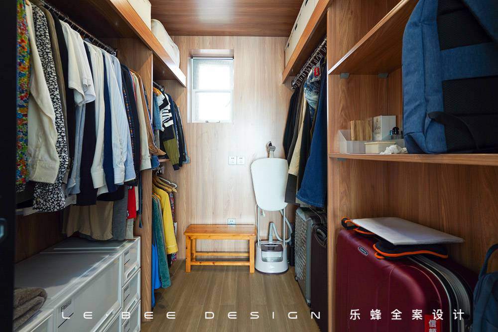 臥室右側是由衛生間改造的步入式衣帽間,木質色調和業主的衣物風格十分相襯。衣帽間格局設置合理,四季衣物和被褥的收納不在話下。墻上的窗口增加自然采光,穿搭效果更加真實。