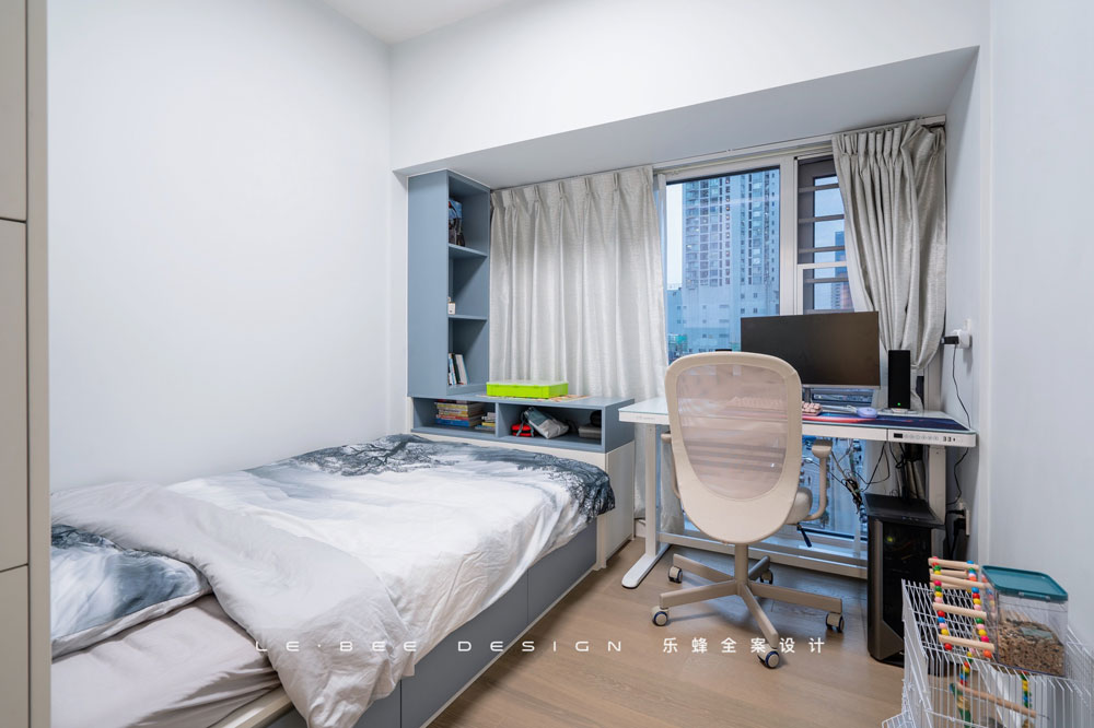 床尾設計成了開放型收納式小書桌,與電腦桌連成一體,增加了整體的可利用空間。
