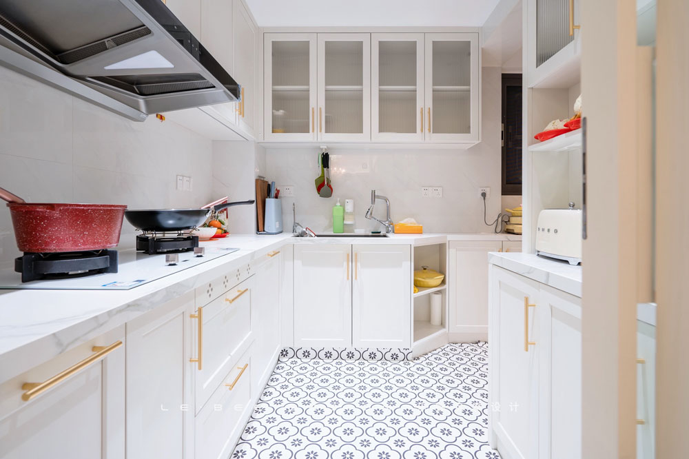 奶油白的櫥柜與主題一致,L形的操作臺布局符合人體工程學,洗、切、炒一些列動作可以流暢順利地完成。