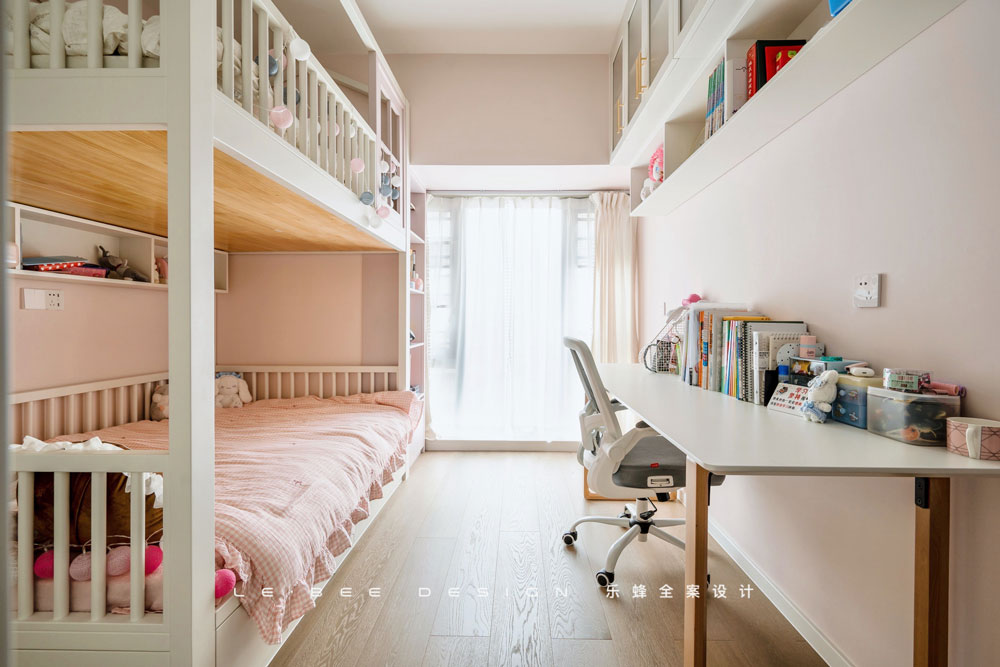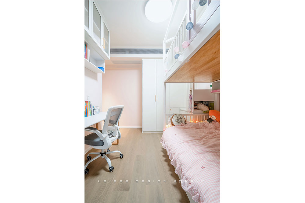 女孩房做了上下鋪的設計,單一的空間也有了流動性。樓梯做成了收納柜的形式,空間利用到極致。整面衣柜的空間,小公主的衣物可以盡情買買買。
