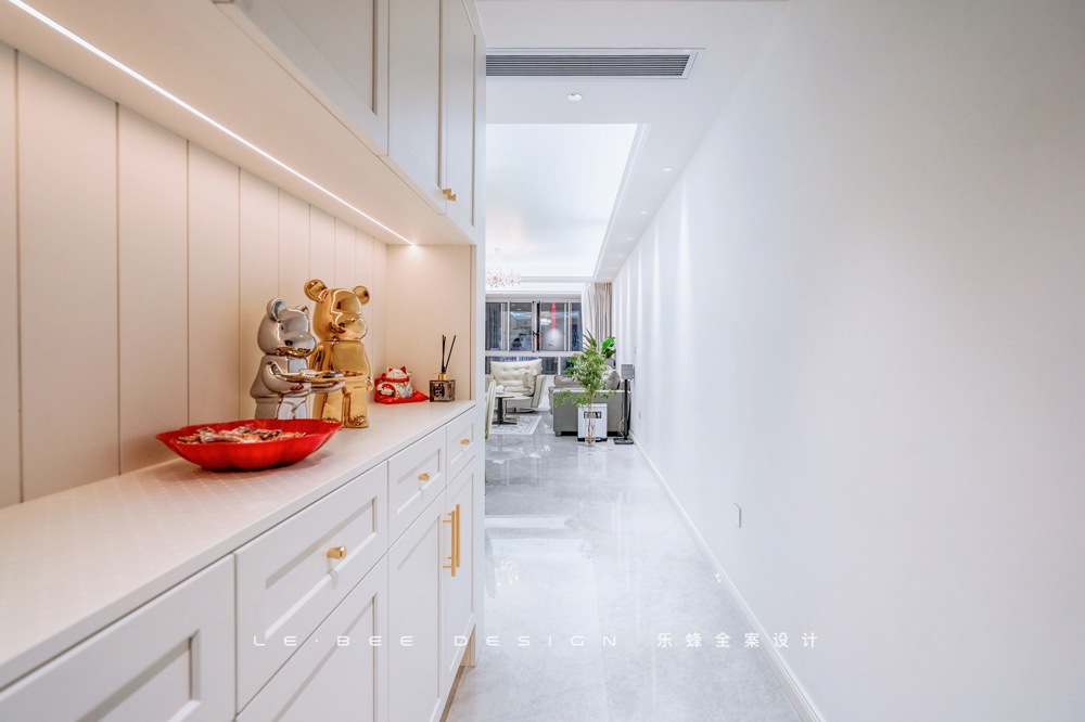 奶白色的柜門,金色的把手配上暖色線性燈,溫暖包裹的感覺立刻侵襲而來。