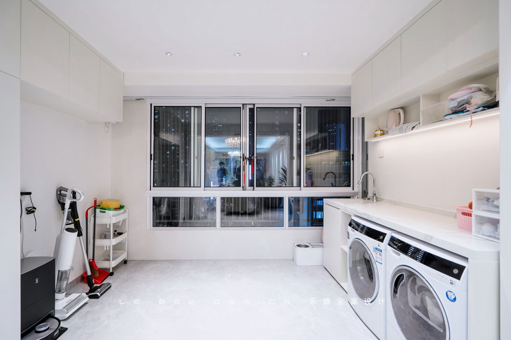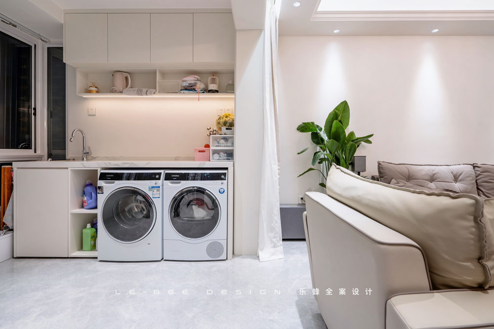 洗衣池上方的儲物柜可以放置洗衣用品。充足的操作臺面讓洗衣都變得輕松很多。