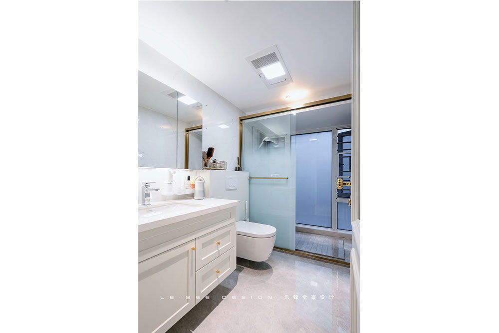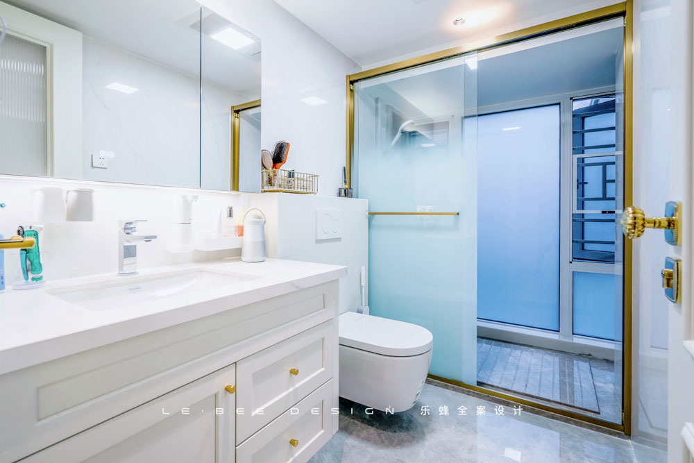 衛生間干濕分離,洗漱區采用了臺下盆加鏡面柜的設計,柜內空間充足,減少了臺面置物的壓力。金色邊框推拉門和白色浴室柜結合,主題風格貫穿始終。