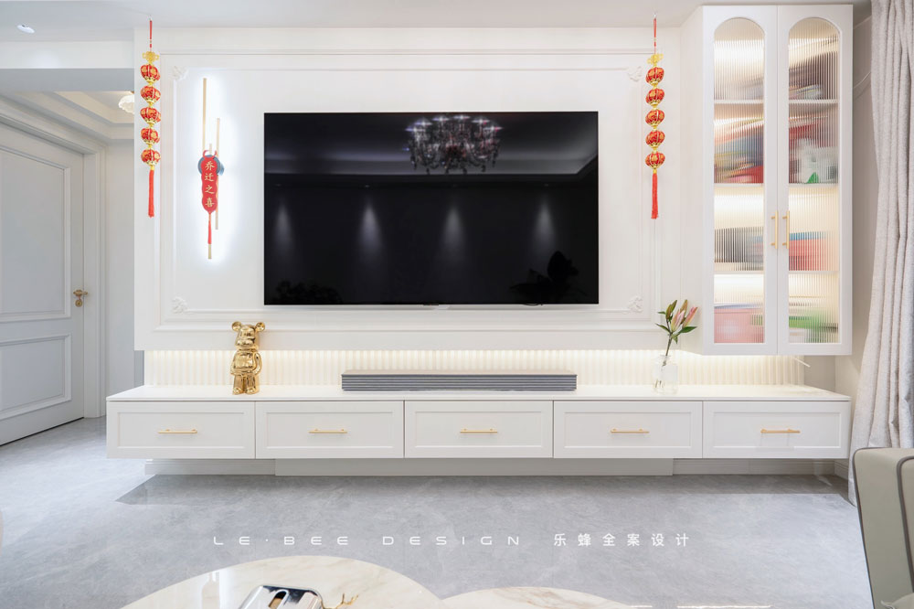 電視背景選用護墻板加柜體的設計,最大程度地保留了簡潔的特色,長虹玻璃柜體又增加了亮點,比例搭配絕佳。