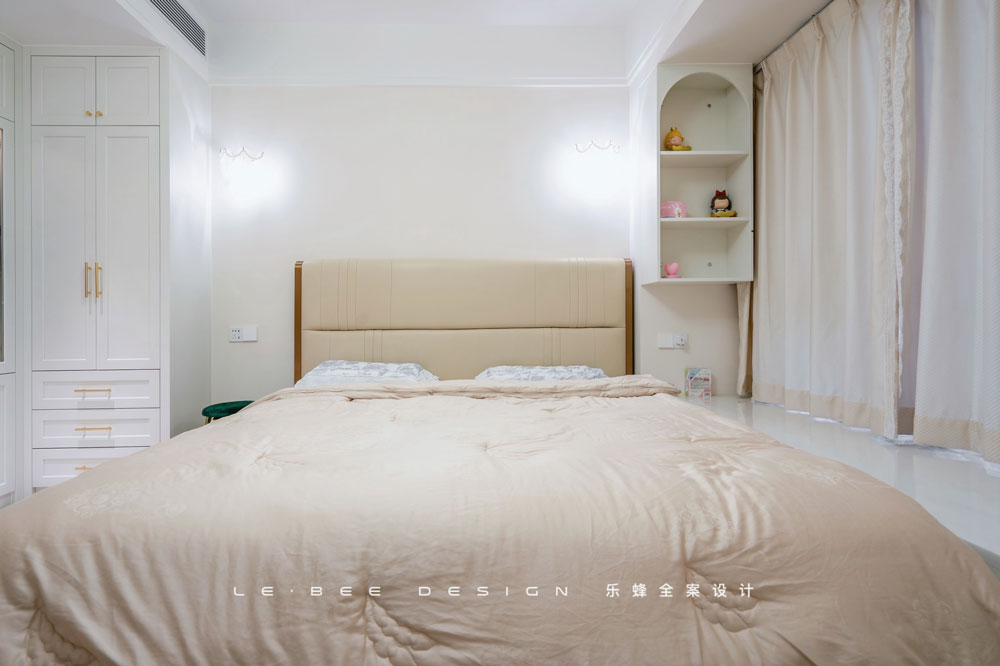 主臥把床安置在飄窗旁,這樣飄窗可以作為床頭柜使用,減少了床頭柜的占用面積又利用好了飄窗,一舉兩得,靠近床邊入眠睡眠質量也會更好。