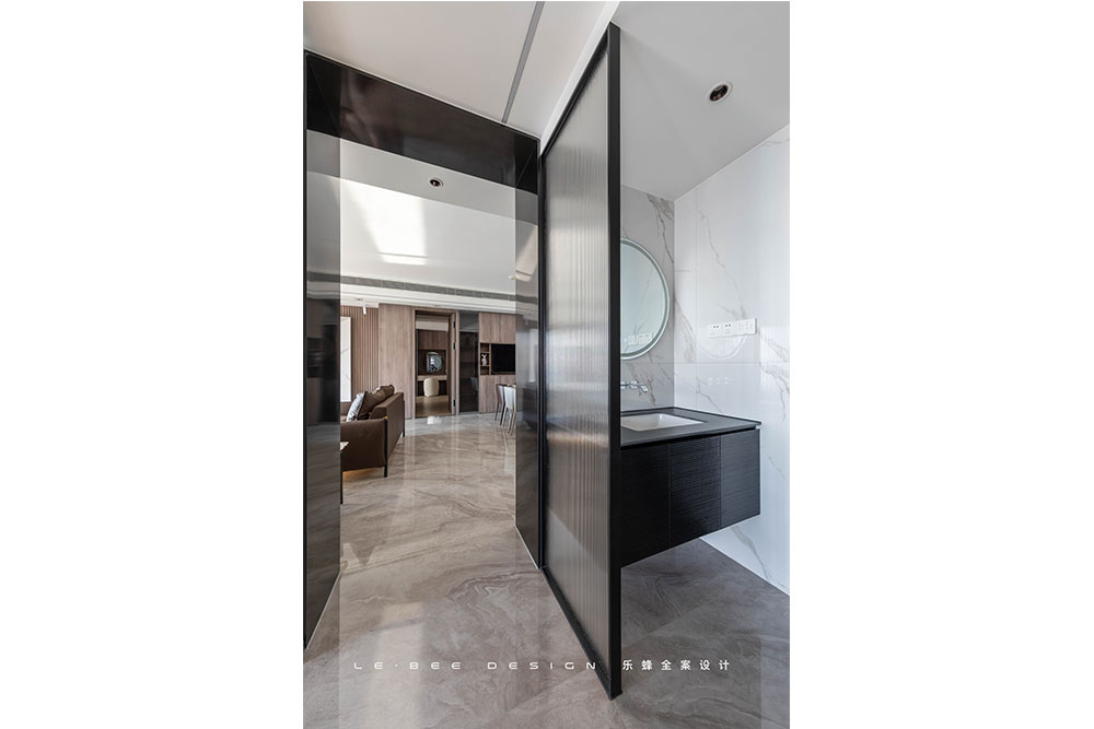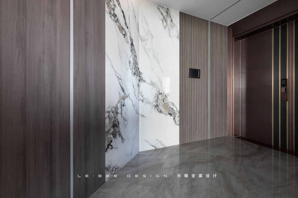 運(yùn)用木格柵、大理石面板、木飾面板對(duì)墻面進(jìn)行三分設(shè)計(jì),奶白的大理石瓷磚和深褐的木質(zhì)面板,顏色和材質(zhì)的相互碰撞,空間的舒張、視覺的沖擊無(wú)限擴(kuò)張。