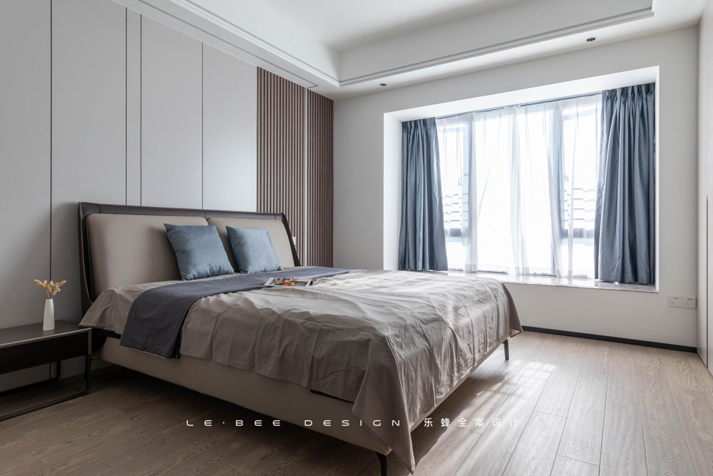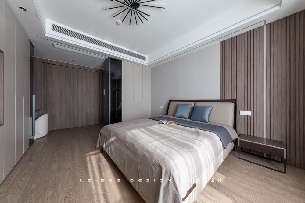 主臥給人的視覺感官倍感舒適,因?yàn)榇竺娣e的木質(zhì)墻面和木地板相連,視覺無(wú)過(guò)度,順滑無(wú)比。