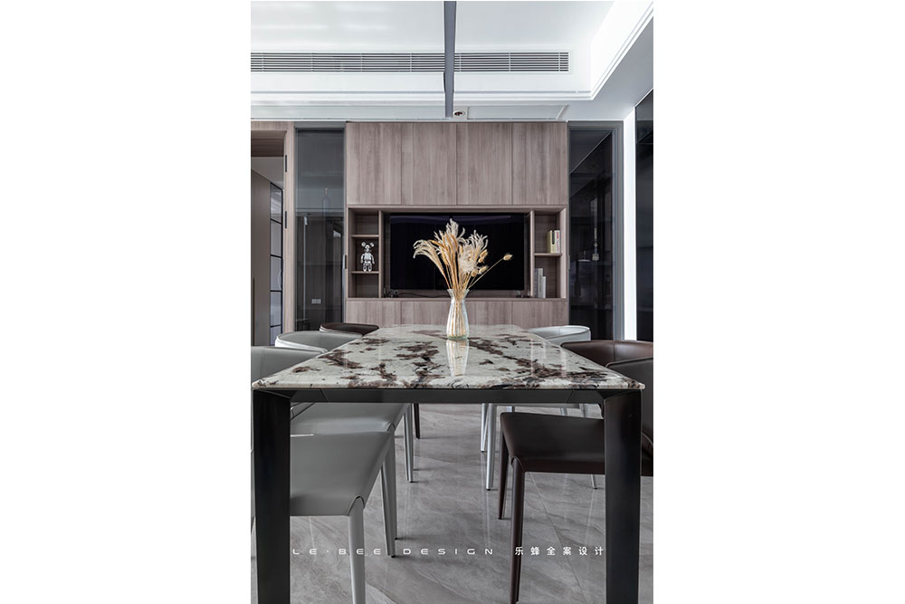 餐廳側(cè)面是一整面餐邊柜的設(shè)計(jì),內(nèi)嵌電視,邊吃飯邊追劇的愿望輕松實(shí)現(xiàn),開放式展示柜和暗色玻璃柜門明暗交錯(cuò),隱私性和裝飾性配合完美。