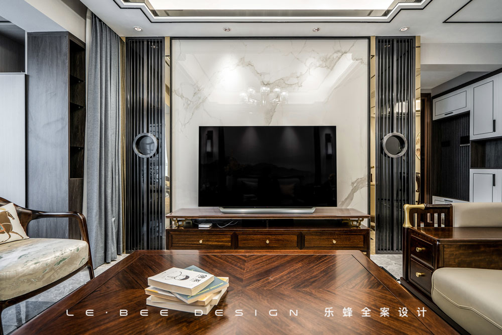 方正工整,干凈利落,氣質的風骨在這種環境下塑造。深色木質桌椅和電視柜為客廳氛圍點下一滴濃墨,電視背景和沙發背景便是其暈開的痕跡。
