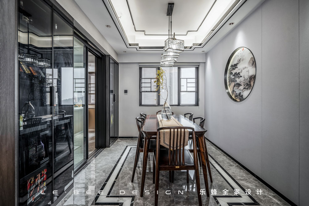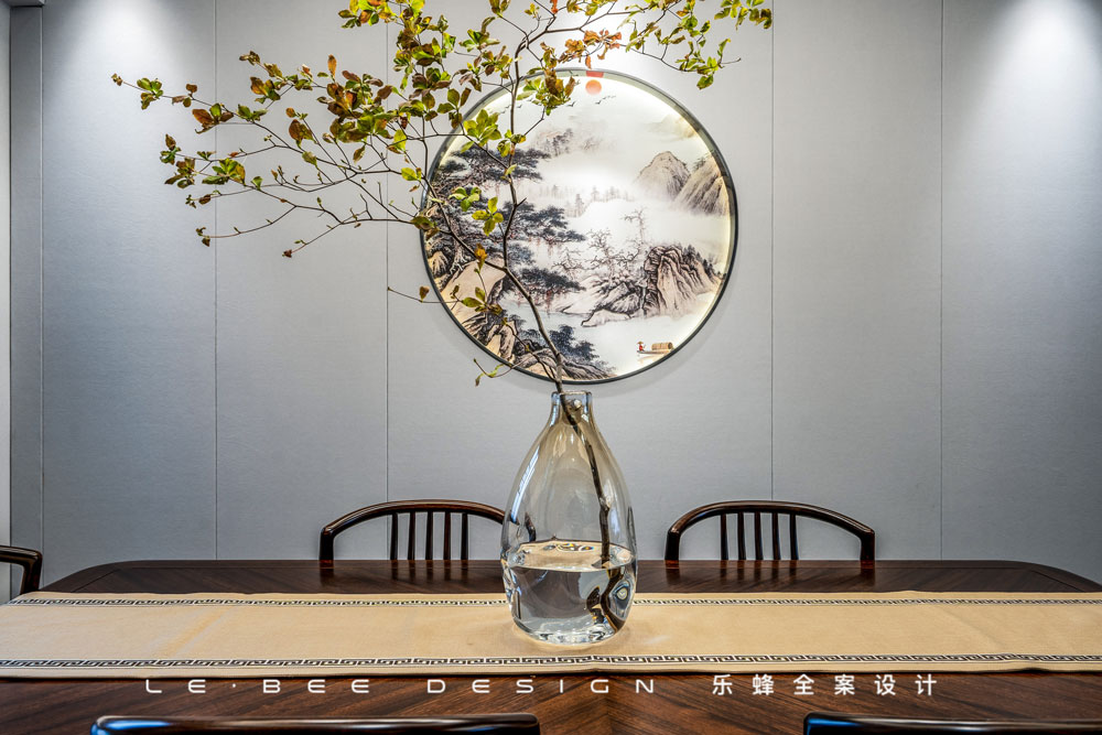 餐廳設計更偏簡約,大面積灰色墻咔作為背景,中間圓形壁畫,整個空間有方有圓,突出中式對于方圓的理念追求。