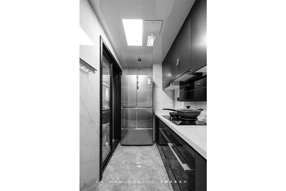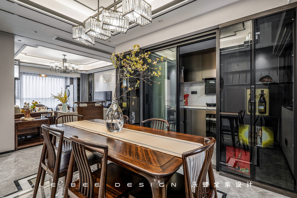 餐邊柜選用了玻璃柜門,加強空間的通透感,玻璃柜門和廚房推拉門相互融合,搭配的妙處無處不在。