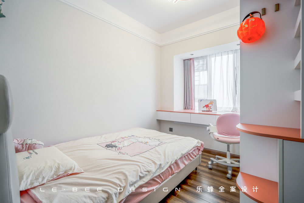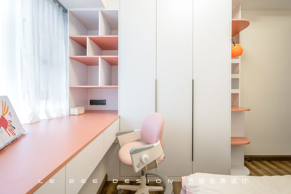 和男孩房想對應的設計思路,顏色選取了女孩們都會喜歡蜜桃粉,營造一個小公主的天地。