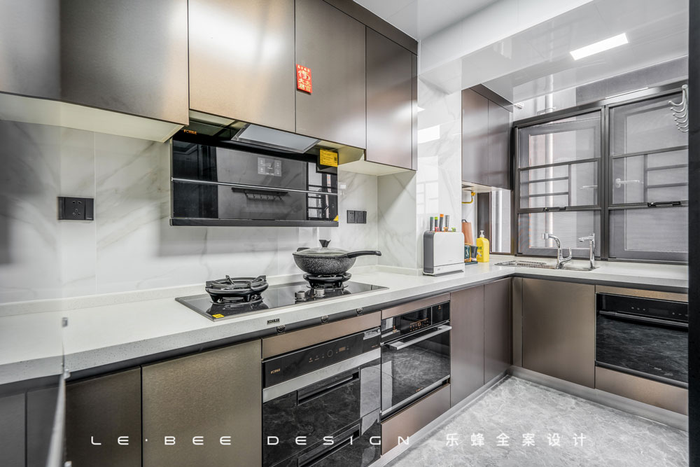 金棕亮面門板使廚房這種充滿現代格調的區域也不脫離整體中式復古氣息,納入小陽臺后廚房空間頓時大了不少,櫥柜容量增加得到增加,讓許多電器都能輕松嵌入。