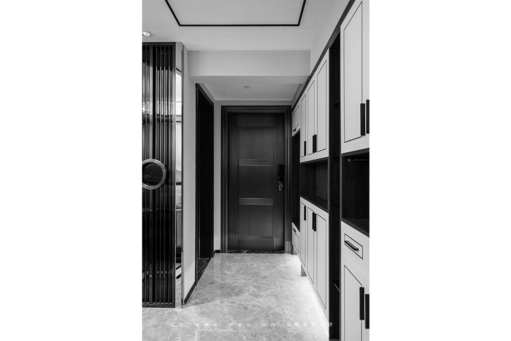 通過擴展后,得到的是一個單獨舒展的玄關空間。黑白搭配是永遠不變的經典,白底的鞋柜門板加上黑色線條,棋盤般的工整有序讓人印象深刻。