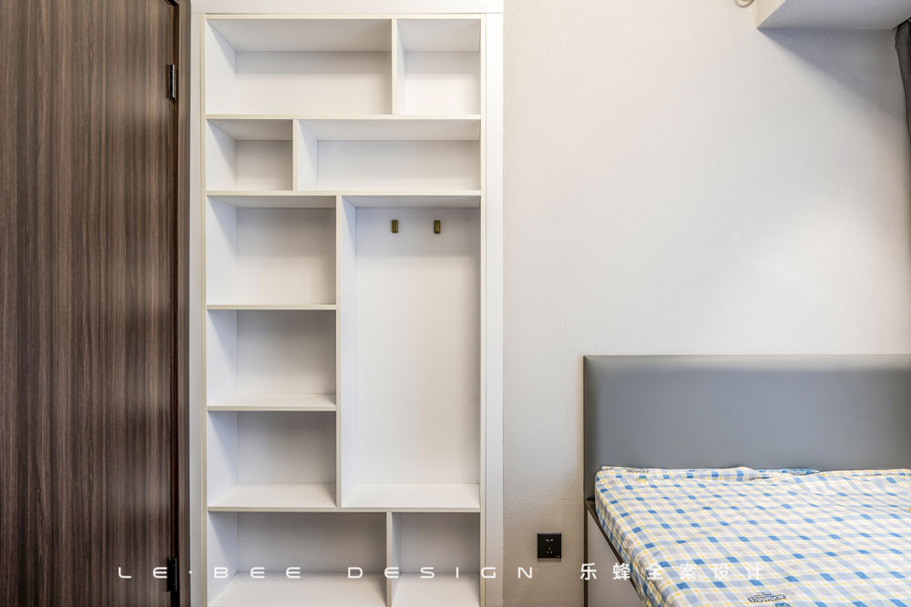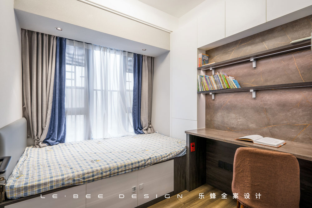 在滿足所有功能需求的前提下,保留了充足的活動空間,床做了榻榻米設計,床下方是抽屜式收納,墻面簡潔直接的線條式書架搭配書桌,學習辦公的最佳場所。