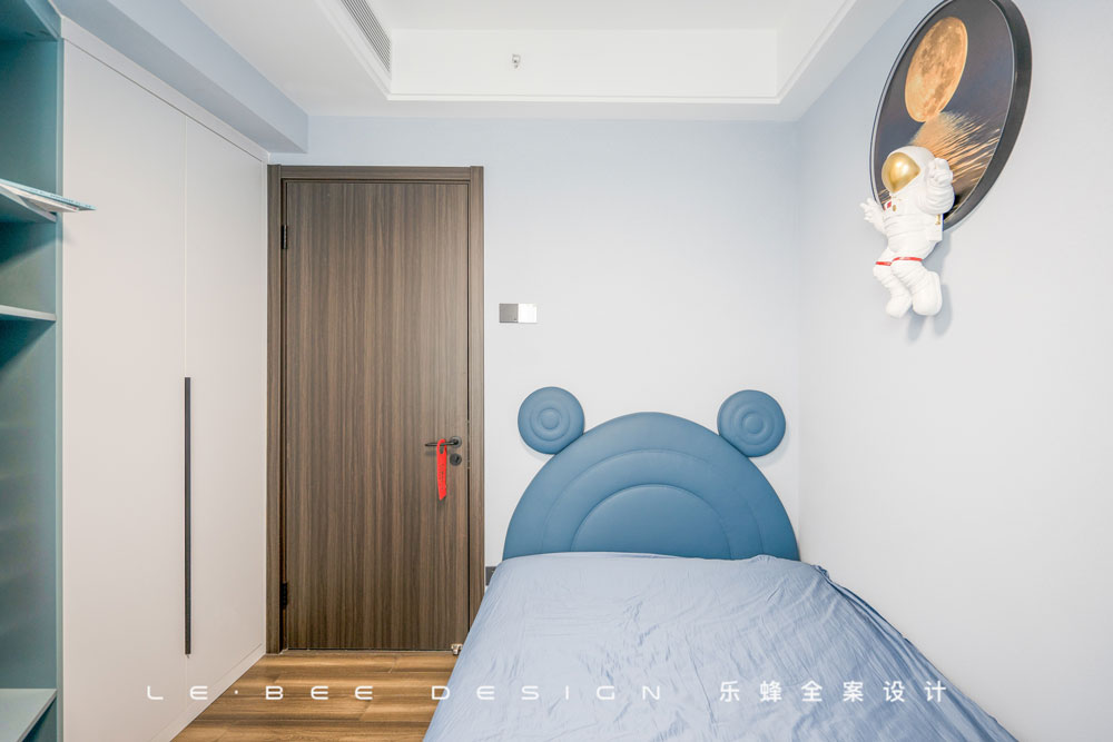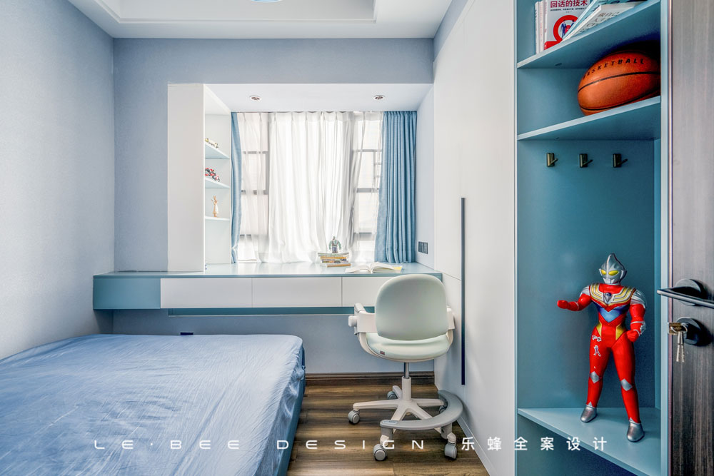 男孩房的設計以藍色為主色調,清新活潑,和白色相搭,仿佛墜入藍天白云的世界。