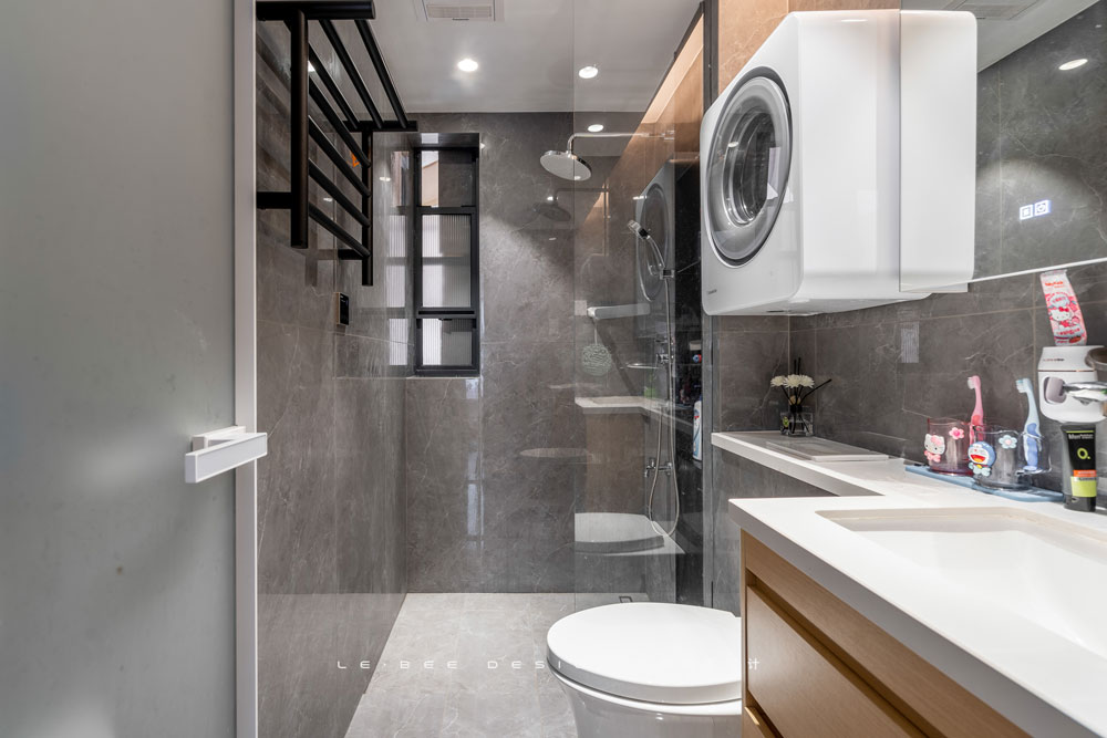 馬桶水箱嵌入墻體,上方作為置物臺(tái),減少衛(wèi)生間置物壓力。馬桶上方墻體安裝掛壁式小型洗衣機(jī),小件衣物直接在衛(wèi)生間清洗,十分方便。